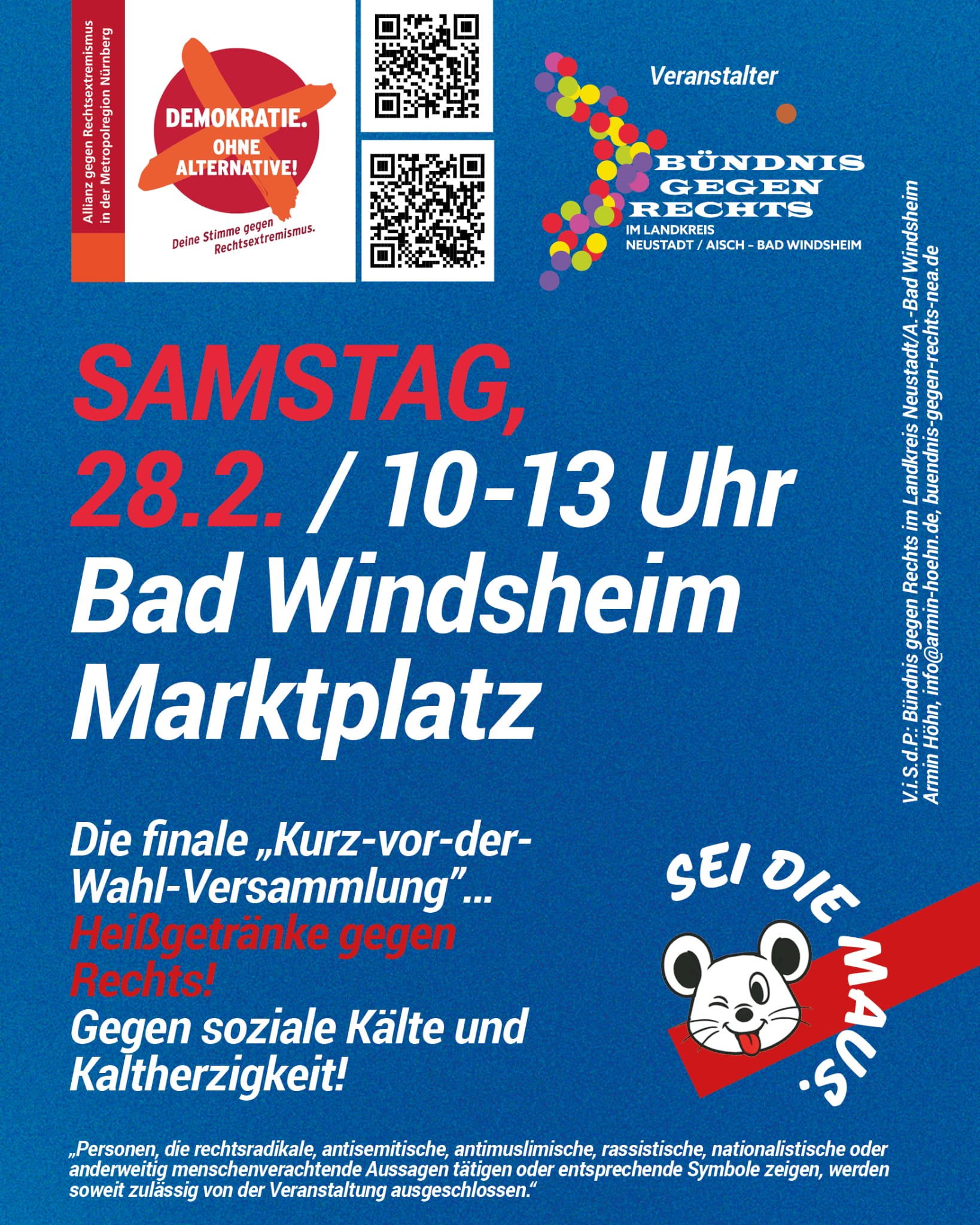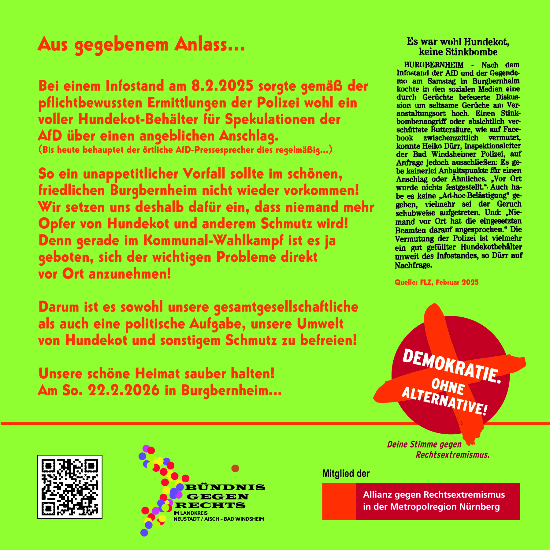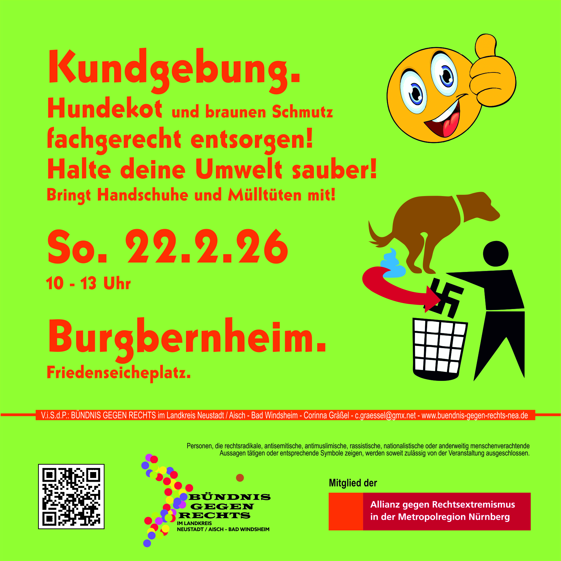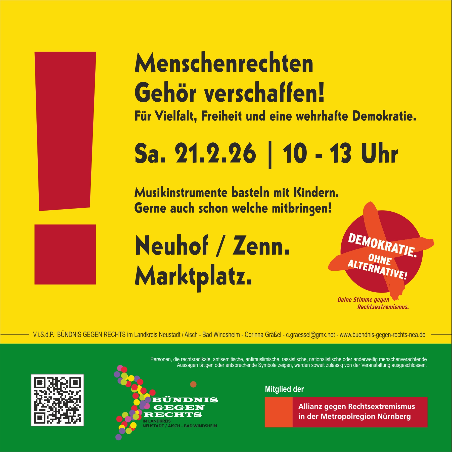 Das Bündnis gegen Rechts im Landkreis Neustadt / Aisch - Bad Windsheim ist ein Zusammenschluss von Menschen aus der Region, die sich gegen Menschenverachtung, Diskriminierung, Ausgrenzung, die Verunglimpfung unseres demokratischen Rechtsstaats und rechte Narrative, etwa die These vom angeblich geplanten "großen Austausch" oder andere Verschwörungserzählungen, einsetzen. Wir stehen für Menschenwürde, Menschenrechte, für unsere Verfassung, unsere parlamentarische Demokratie, unseren sozialen Rechtsstaat, für Respekt, Toleranz und die Bewahrung unserer friedlichen, toleranten Gesellschaft. Das Bündnis gegen Rechts unterstützt auch die Allianz gegen Rechtsextremismus in der Metropolregion.