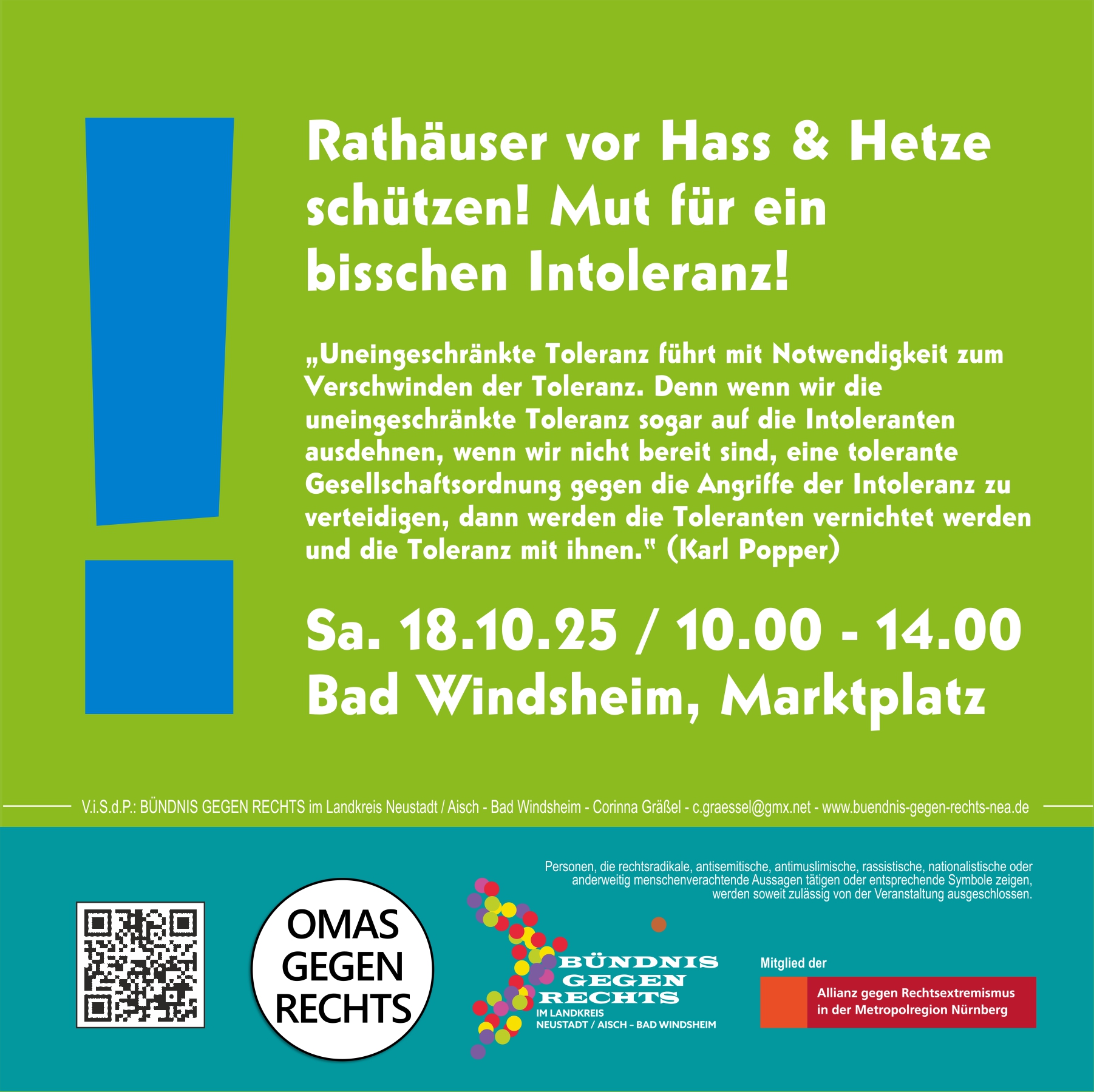 Das Bündnis gegen Rechts im Landkreis Neustadt / Aisch - Bad Windsheim ist ein Zusammenschluss von Menschen aus der Region, die sich gegen Menschenverachtung, Diskriminierung, Ausgrenzung, die Verunglimpfung unseres demokratischen Rechtsstaats und rechte Narrative, etwa die These vom angeblich geplanten "großen Austausch" oder andere Verschwörungserzählungen, einsetzen. Wir stehen für Menschenwürde, Menschenrechte, für unsere Verfassung, unsere parlamentarische Demokratie, unseren sozialen Rechtsstaat, für Respekt, Toleranz und die Bewahrung unserer friedlichen, toleranten Gesellschaft. Das Bündnis gegen Rechts unterstützt auch die Allianz gegen Rechtsextremismus in der Metropolregion.
